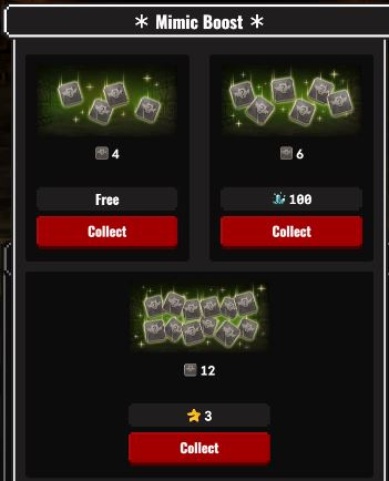 上記のミミックのスターも課金要素の1つですが、さらに新たに3つのブーストが登場してそれぞれクリスタル、スターを消費する事で大幅に強化が可能になりました。